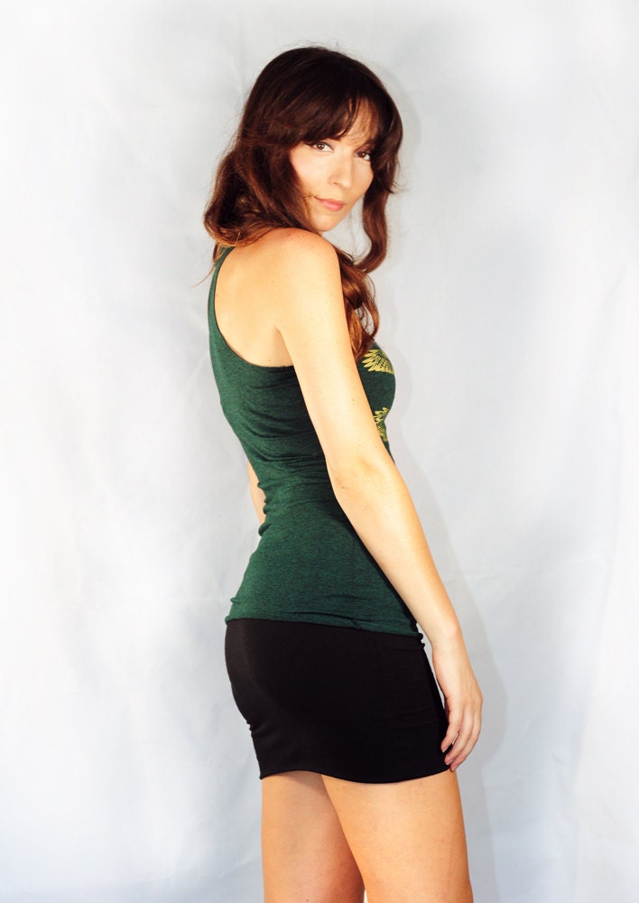 Printed on a green racer back tank top